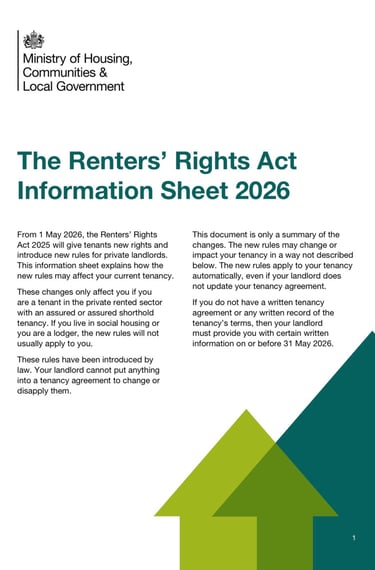 The UK Government has introduced a mandatory Renters' Rights Act Information Sheet that must be distributed to all existing tenants by 31 May 2026. Failure to comply with these regulations could result in a fine of £7,000.