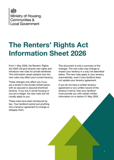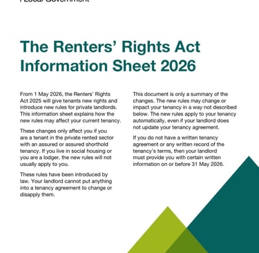 The UK Government has introduced a new legal requirement that all landlords must be aware of. A mandatory Renters' Rights Act Information Sheet must be provided to all existing tenants no later than 31 May 2026.